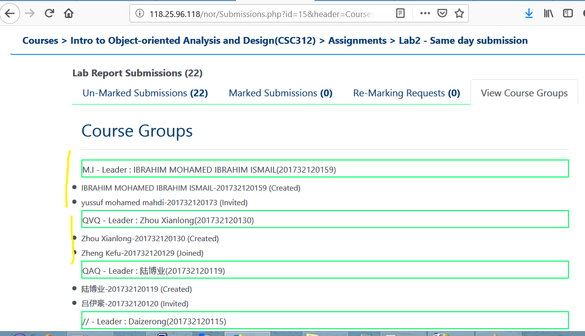 Created attachment 17 [details] Separate each group using larger space It is a bit hard for first-time user to figure out group information. For example, at first glance, I could not tell whether the first two bullets belong to the first green box or the second green box. See the attached figure. Why not consider the following organization? -------------------------------------- Group Name: M.I. # Bold face Group Leader: IBRAHIM (201732120159) Group Member: Yussuf (201732120173) -------------------------------------- -Hui