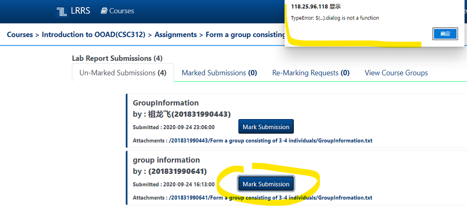 Created attachment 58 [details] Mark Submission no longer working (Alas, it worked before.) Afer I clicked the "Mark Submission" button, I saw this prompt: TypeError: $(...).dialog is not a function See the attached picture for more detail. -Hui