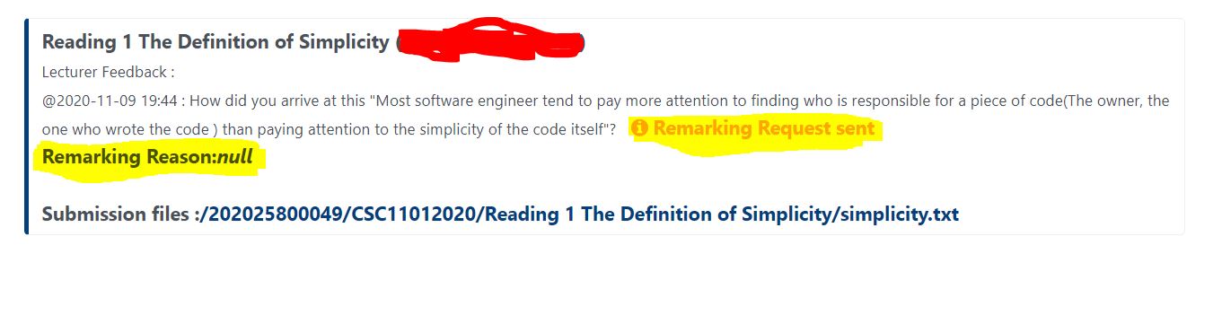 Created attachment 67 [details] unable to edit the remarking reason While checking the mark of my previous assignment, I found the feedback from the instructor asking me to explain a sentence. I clicked the button to submit my answer and a small tab having two-button ("ENTER" and "CANCEL") and an answer text area shows up. I clicked the CANCEL button without writing anything in the answer text area and I got the following result(see attachment) with no possibility to change the answer.