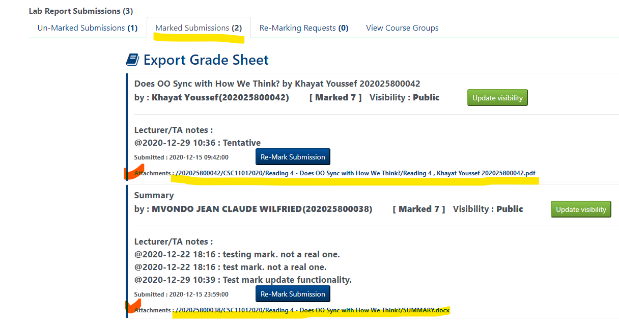 Created attachment 83 [details] Unable to download marked submissions After marking an assignment, I am no longer able to download its attachment. Got the following error message: Not Found The requested URL /nor/Lab_Report_Submisions/202025800042/CSC11012020/Reading 4 - Does OO Sync with How We Think was not found on this server. See the attached picture for the two files that I could not download (with a red tick before each file). -Hui