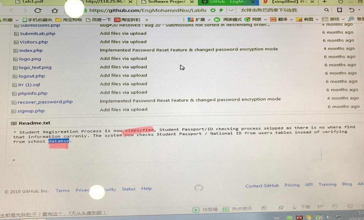 Created attachment 12 [details] Two typos in README Hello Nor https://github.com/EngMohamedNor/LabReportRepo Two typos in Readme.txt at the above link, simplyfied and databse. See the attached picture. -Hui