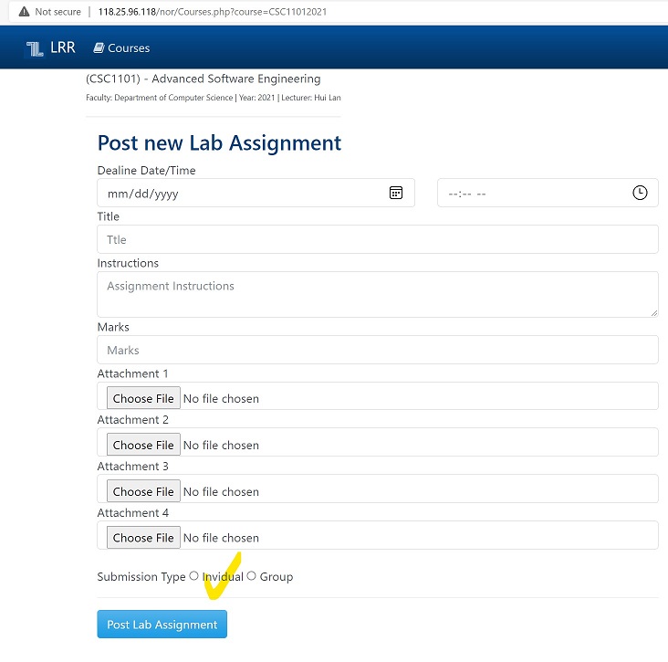Created attachment 149 [details] TheTypo "Invidual" is a typo in the page with this URL: http://118.25.96.118/nor/Courses.php?course=CSC11012021 See the attached figure. Note: you need an Instructor account to access the above link. Hui