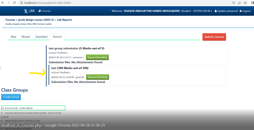 Created attachment 219 [details] Assignments Do Not Align Properly A student's assignments do not align properly under his Marked tab. There are two vertical blue lines, one long and another short (see the attached picture). -Hui
