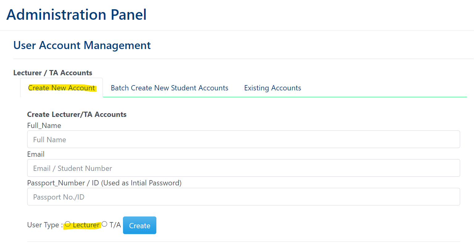 TA (Teaching Assistant) account creation should only be done by a lecturer.