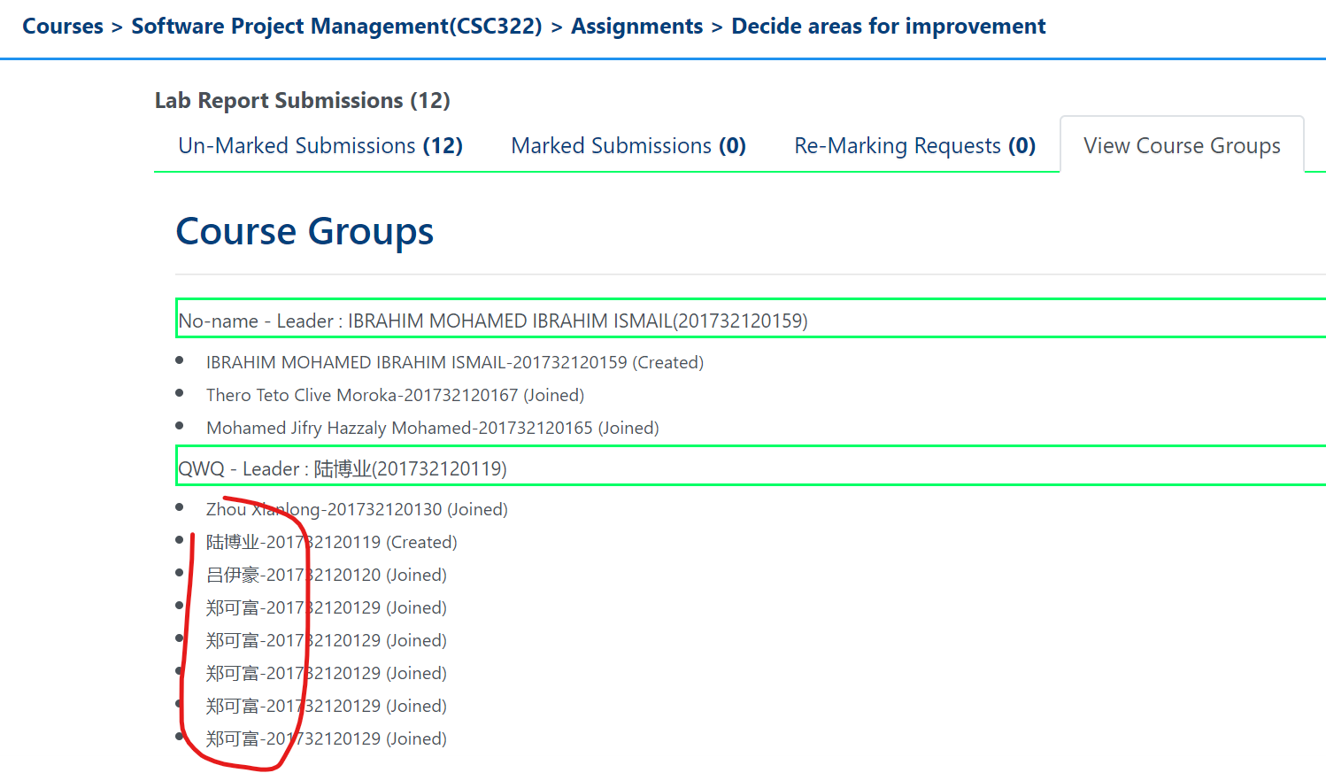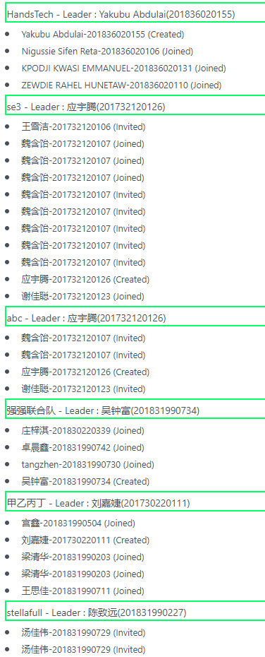 Created attachment 37 [details] Repeated names in a course group QWQ - Leader : 陆博业(201732120119) Zhou Xianlong-201732120130 (Joined) 陆博业-201732120119 (Created) 吕伊豪-201732120120 (Joined) 郑可富-201732120129 (Joined) 郑可富-201732120129 (Joined) 郑可富-201732120129 (Joined) 郑可富-201732120129 (Joined) 郑可富-201732120129 (Joined) See the attached picture, too. -Hui
